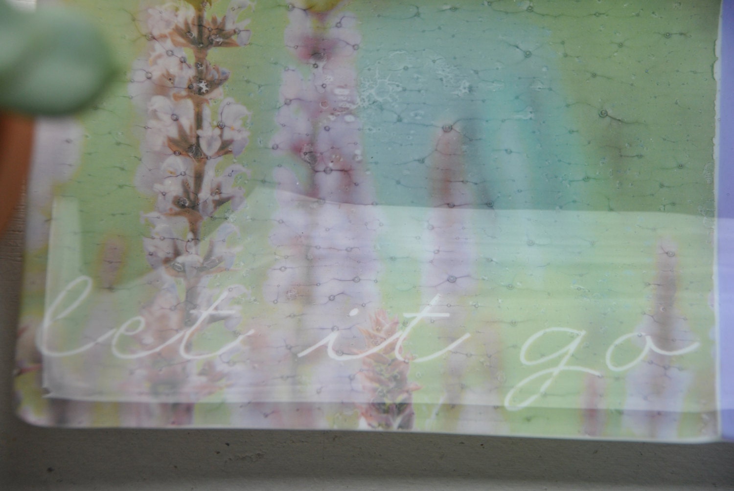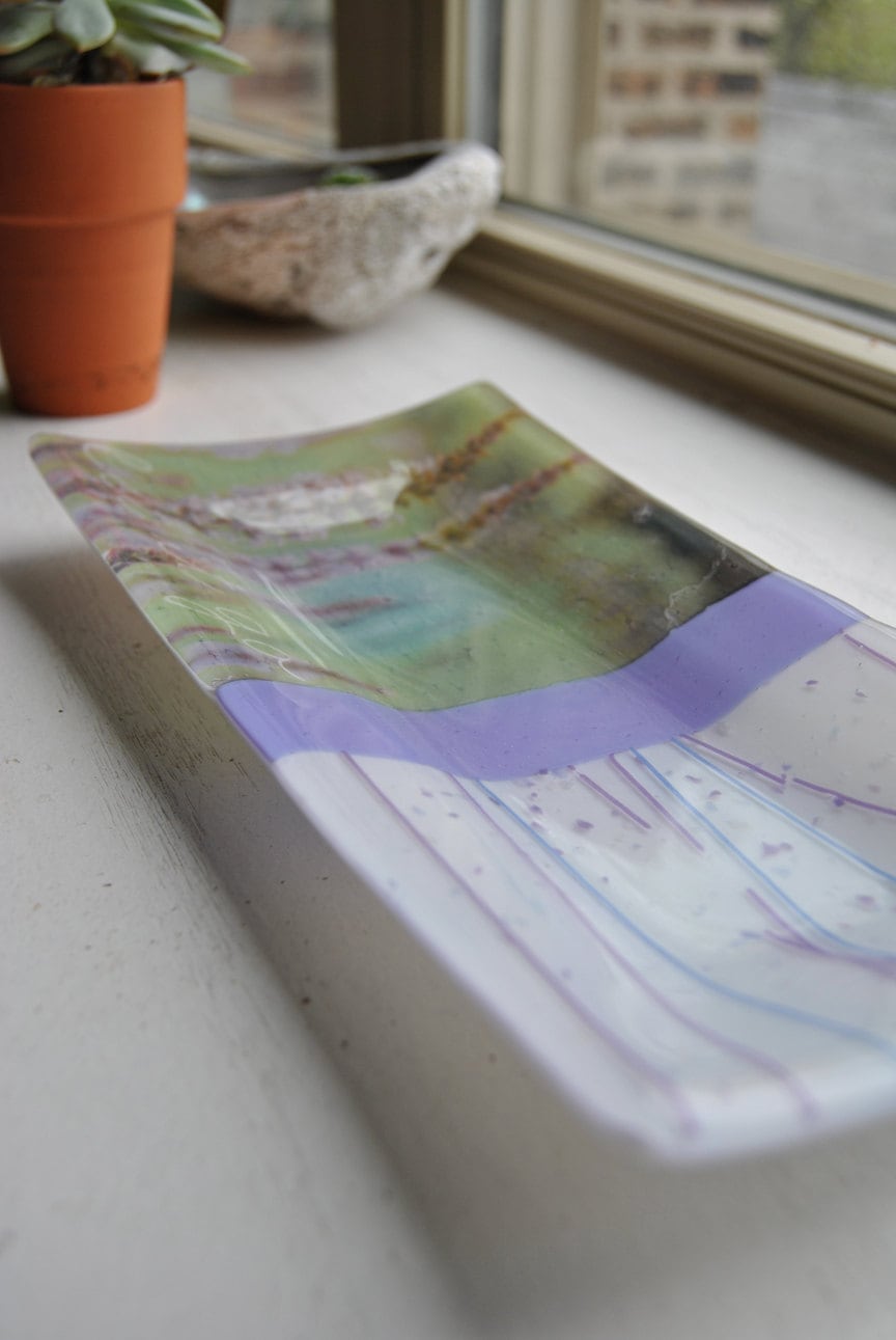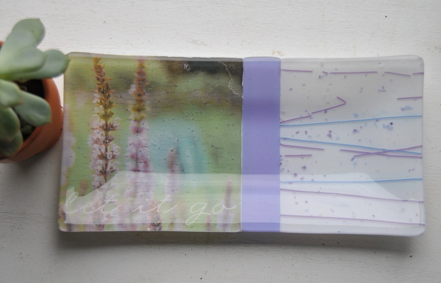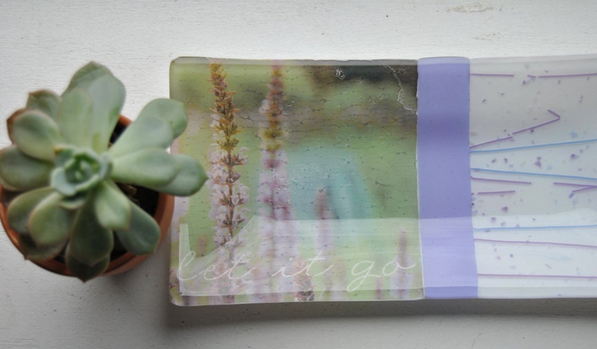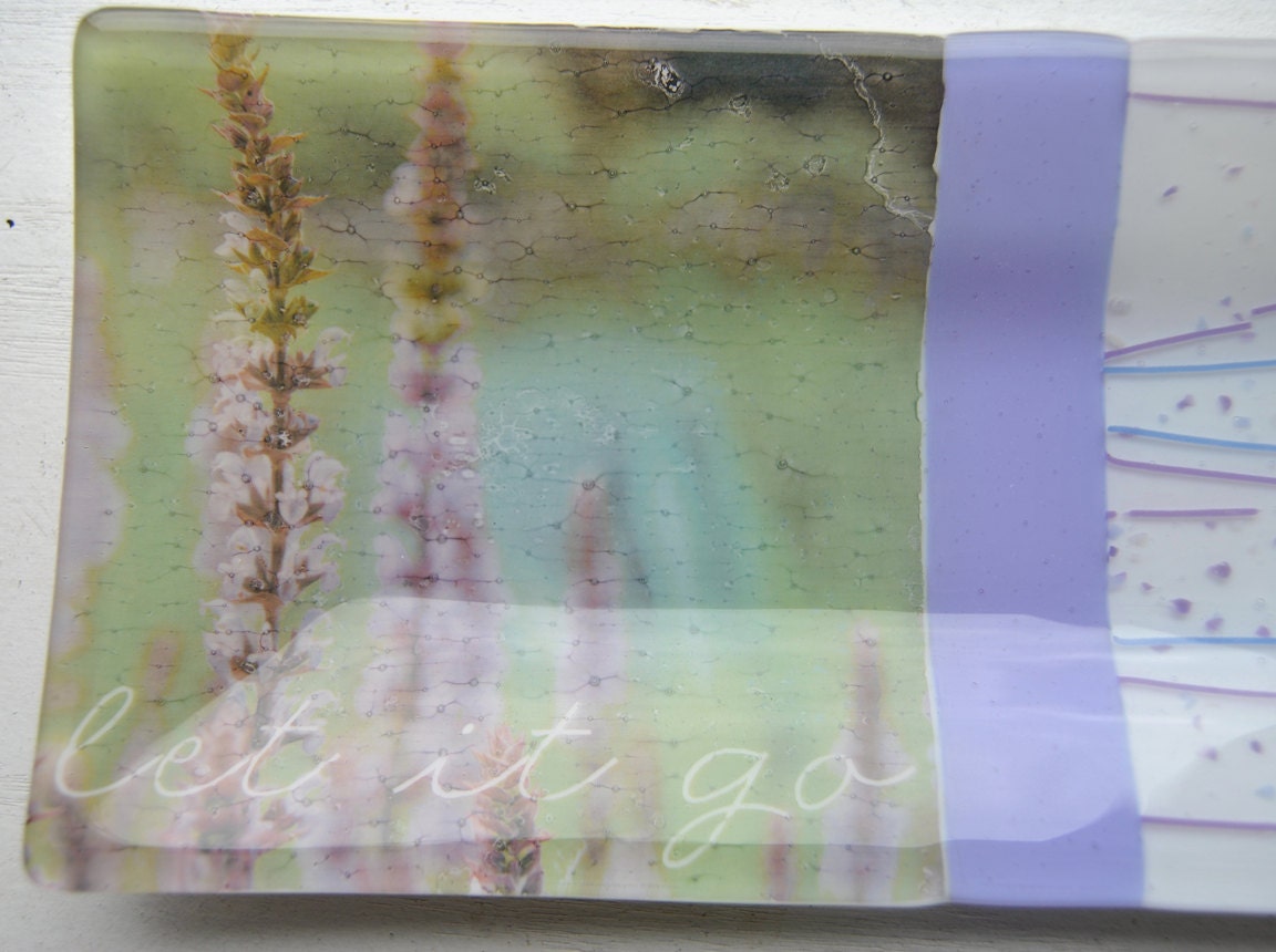 This is a listing for a glass fused plate measuring approx. 5"x10" with white and purple glass with purple and blue confetti and striped glass. Lavender flowers and phrase "let it go" decal on left side.