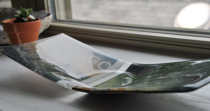 Glass is COE90 and is fused in a sushi plate geometric style.