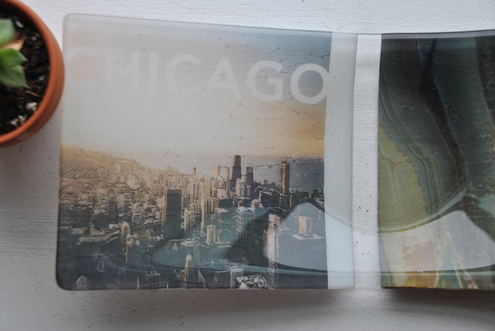 This is a listing for a glass fused plate measuring approx. 5"x12" with black/white transparent swirly glass (at bottom) and ivory glass with an image of Chicago.