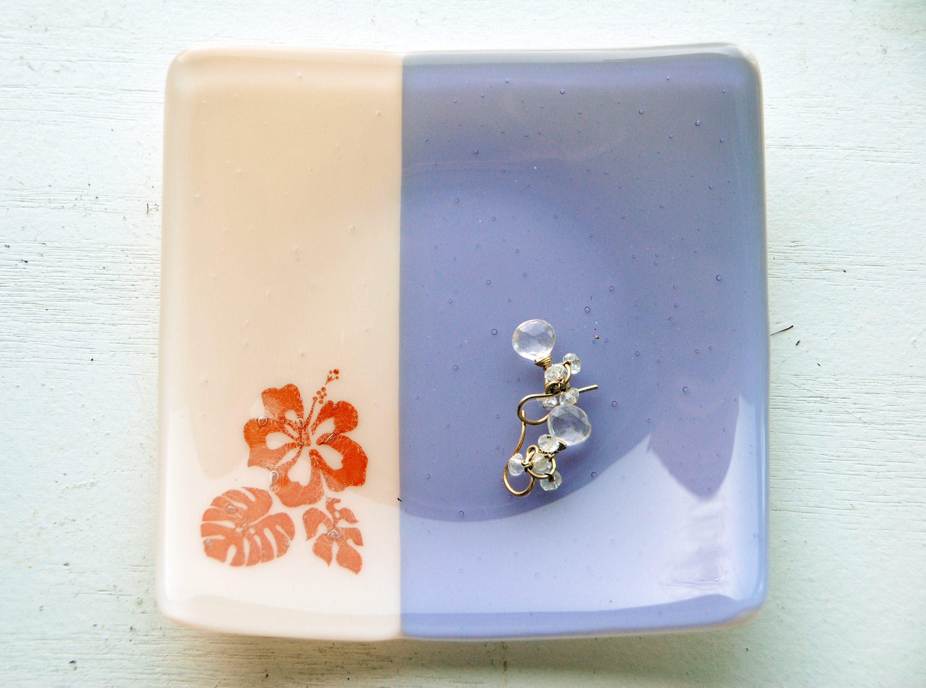 This is a listing for a glass fused plate measuring approx. 5"x5" with lavender/purple and beige/light peach glass with an image of a hibiscus in reddish-brown. Glass is COE90 and is fused in a sloped square-style plate.
